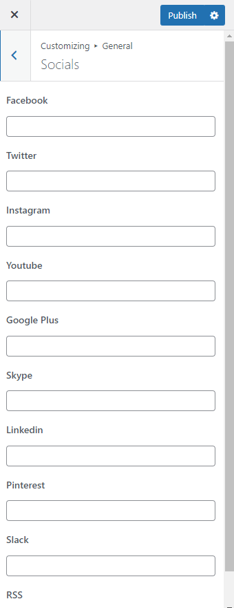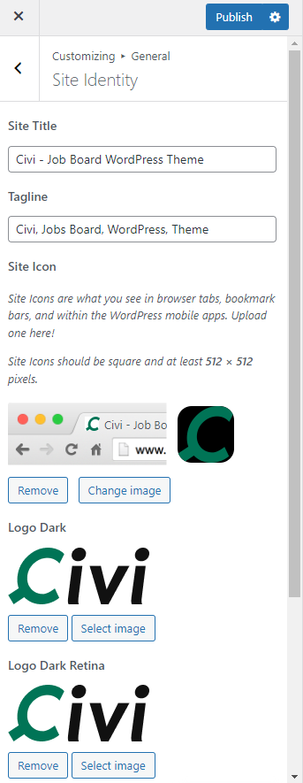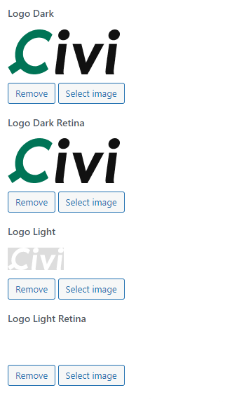 **Logo Dark, Logo Light** – Upload your custom brand image then display it as a site logo in the site header.