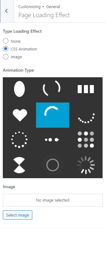 **Preloader Animation** – Use this option to choose one of the prebuilt CSS preloader animations. Consider that you can not add more animations by default.