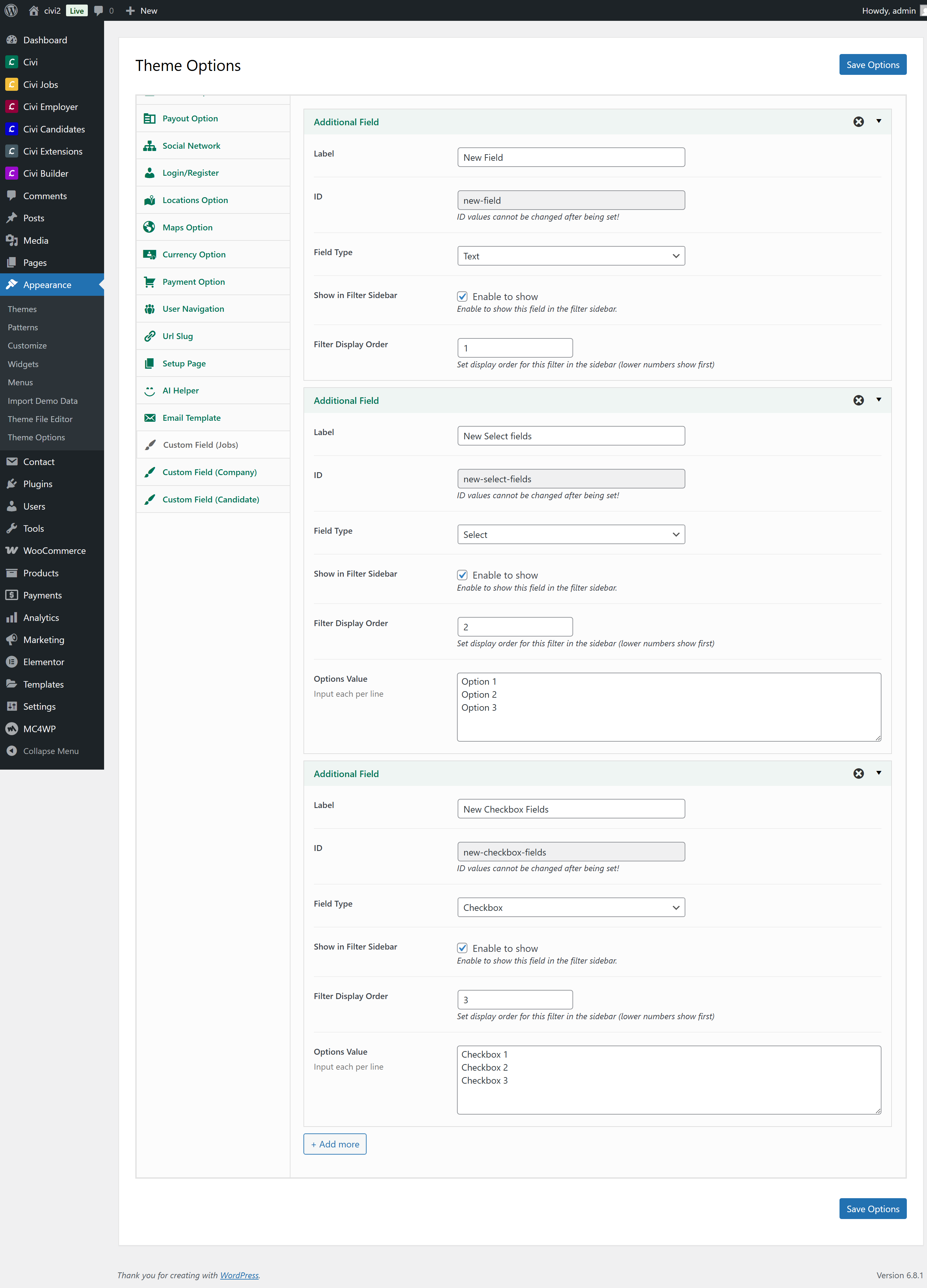 1. Go to **Theme Options** ⇒ **Custom Fields (Jobs)** ⇒ Create your custom fields