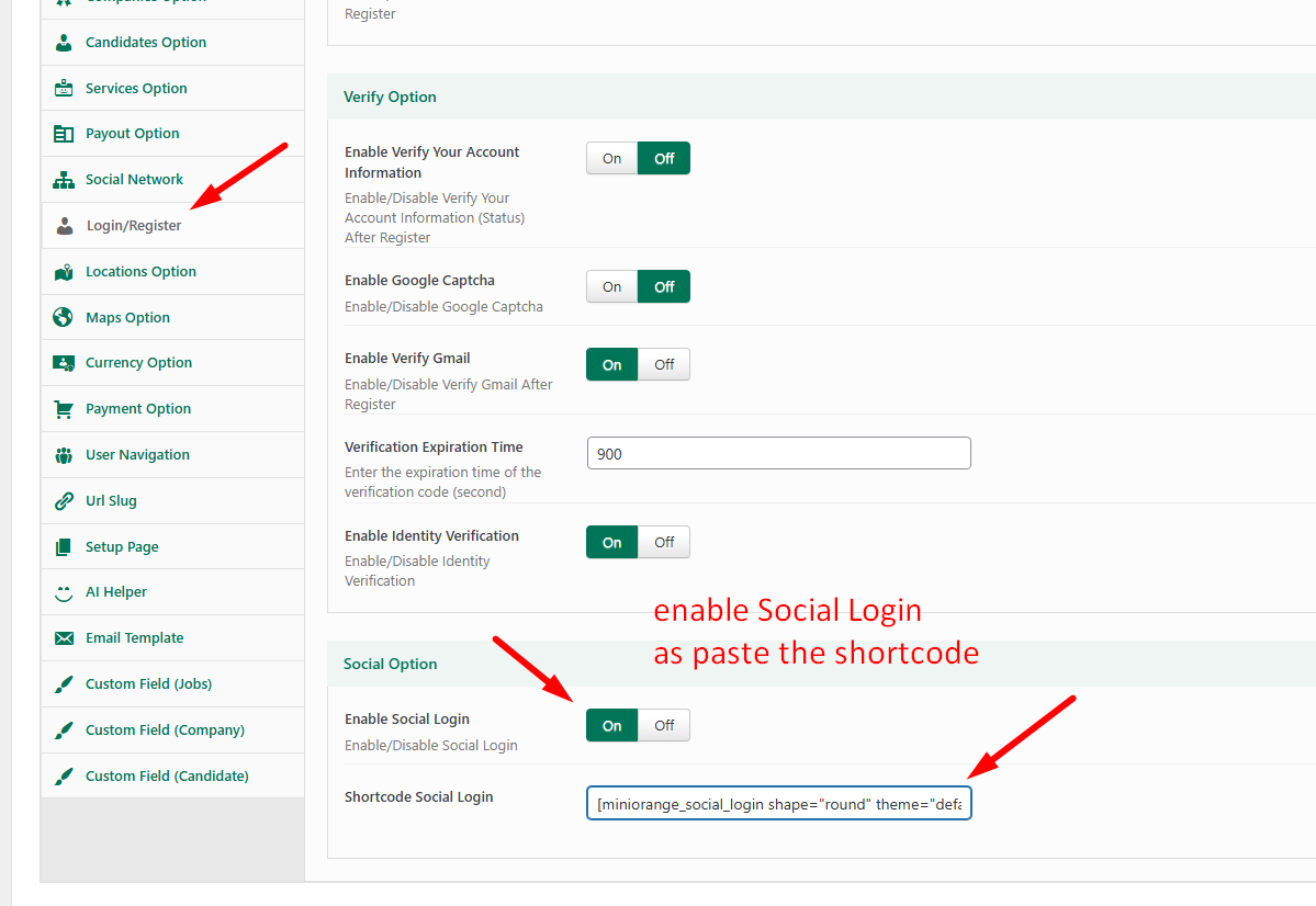 Go to Theme Options ⇒ Login/Register ⇒ Social Option. Then paste the shortcode of MiniOrange into the input field. Then "Save" it.