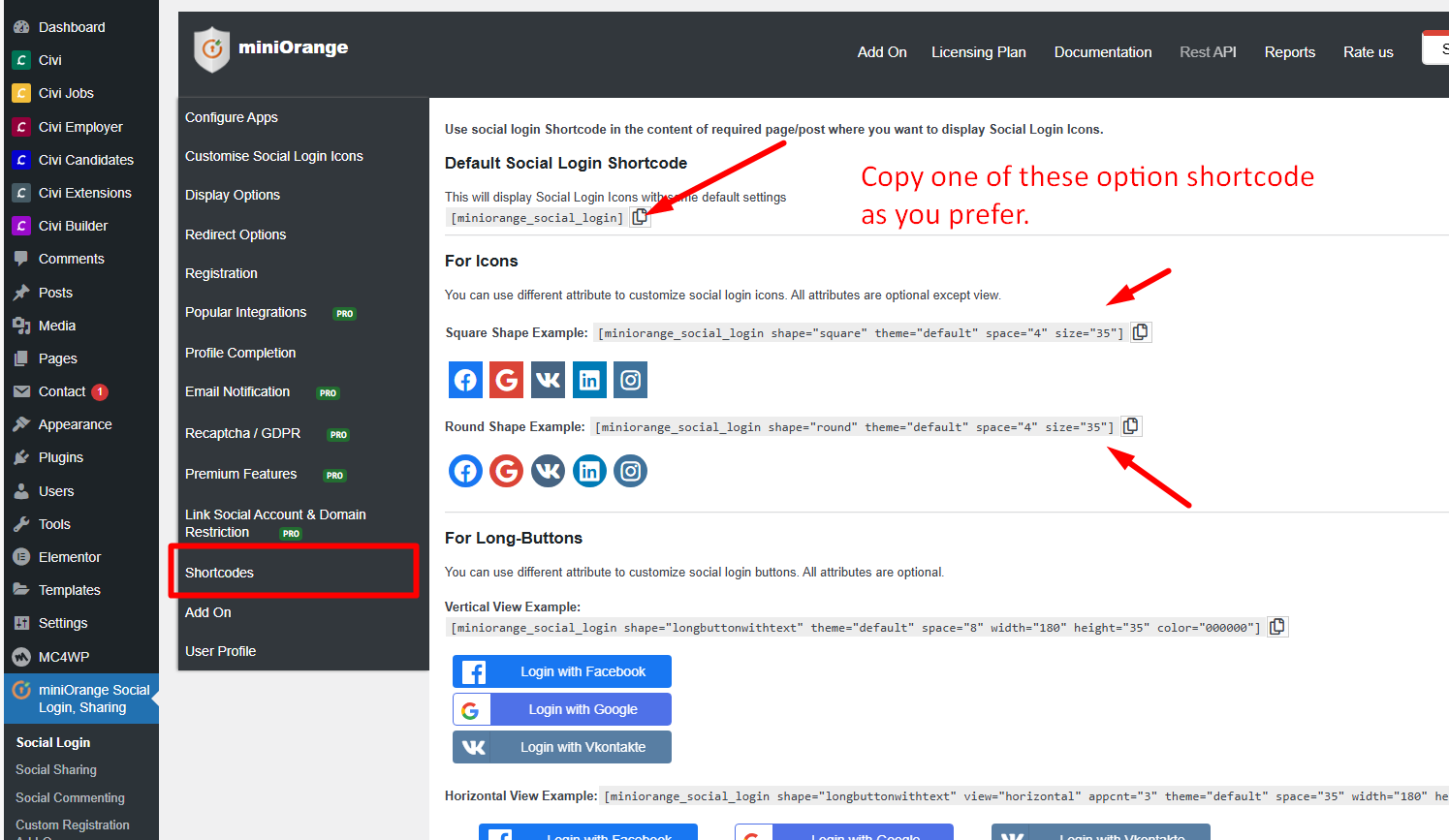 Copy the shortcode from miniOrange and paste it into Login field of Civi.