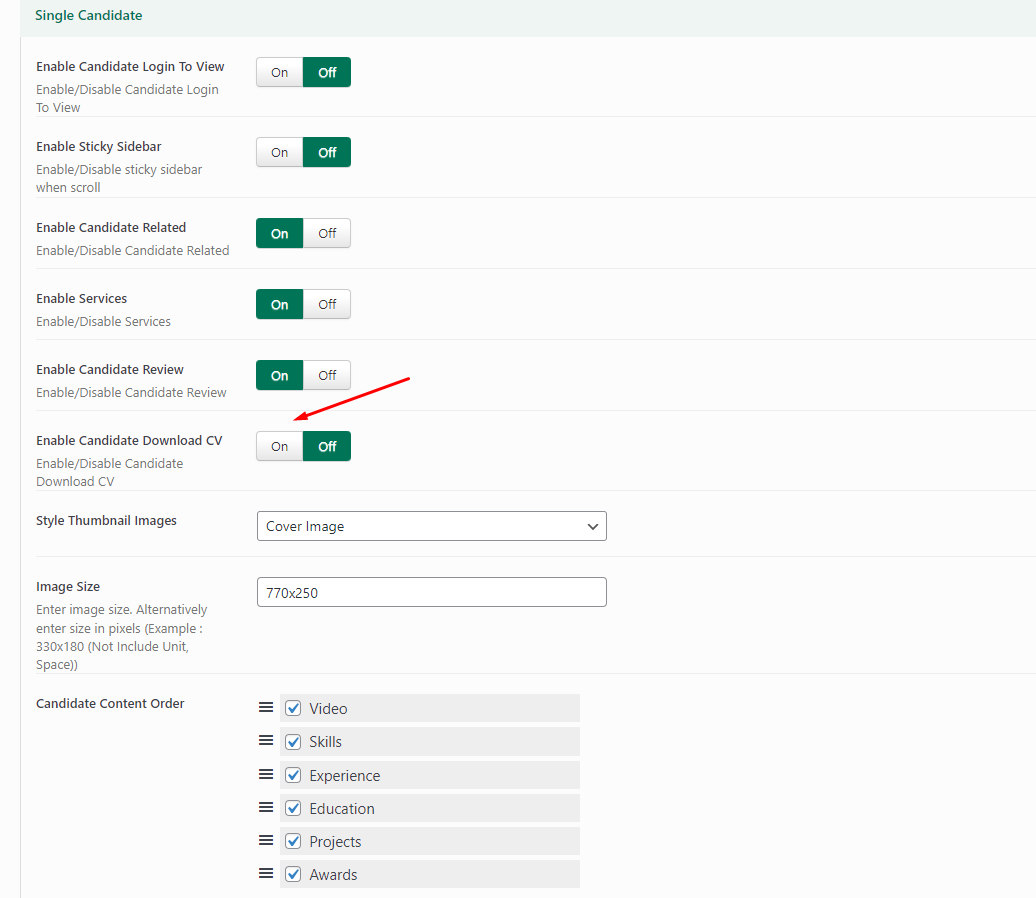 2. In the tab Single Candidate -> Find Option **Enable Candidate Download CV -> Select " On"**